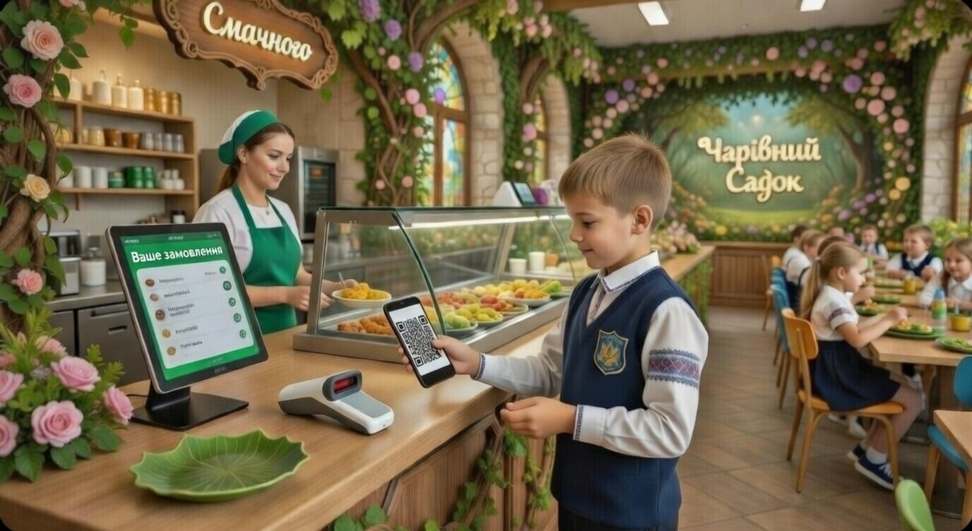 Дитина відвідує їдальню та просканувавши QR-код - отримує своє замовлене батьками харчування. Без карток та готівки — все автоматизовано й швидко!